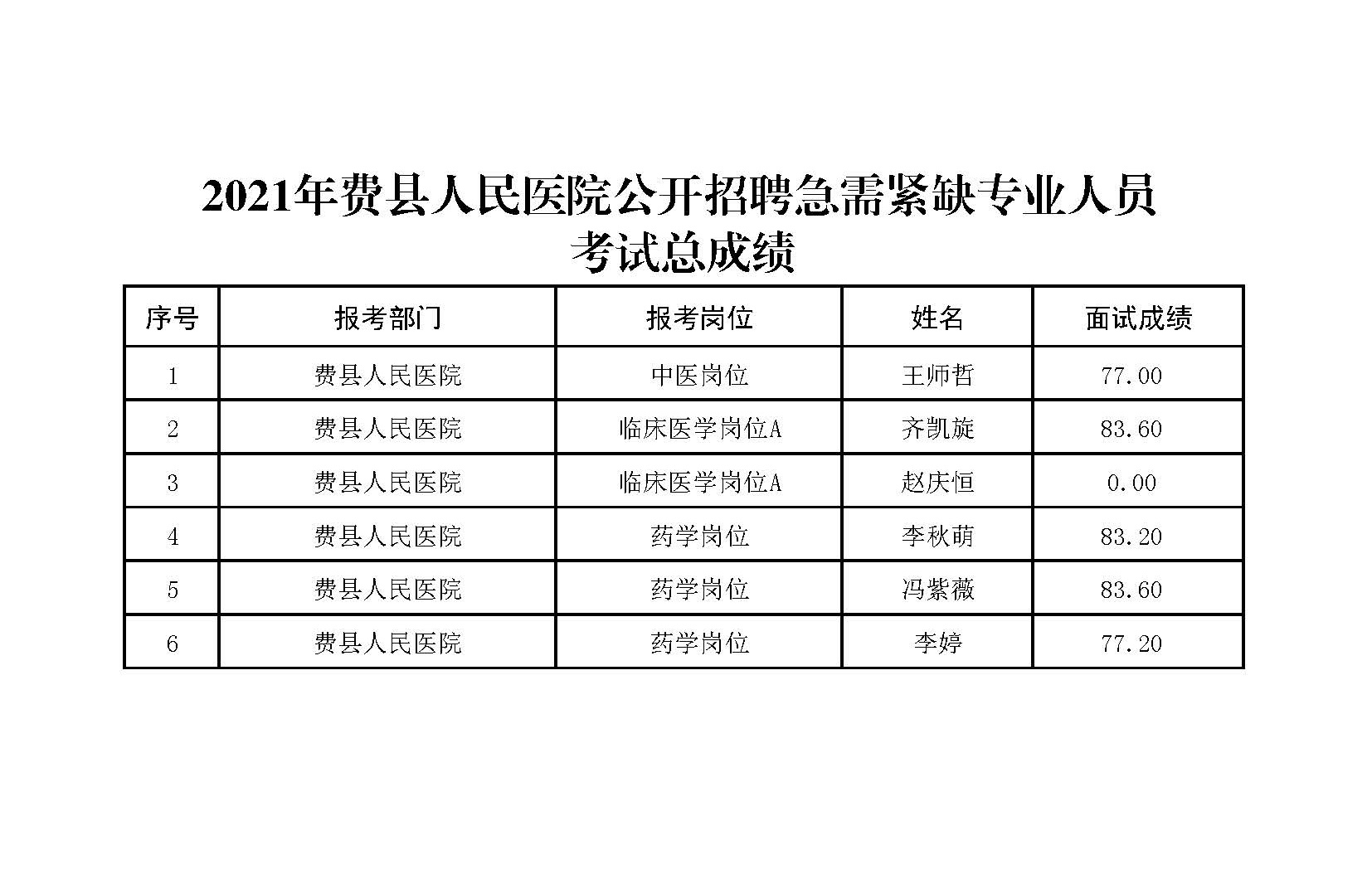 附件1:2021年费县人民医院公开招聘急需紧缺专业人员考试总成绩