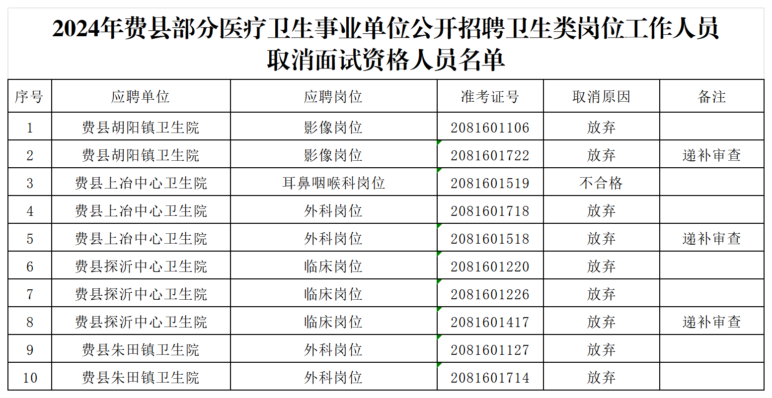 根据《2024年费县部分医疗卫生事业单位公开招聘卫生类岗位工作人员简章》和《2024年费县部分医疗卫生事业单位公开招聘卫生类岗位工作人员面试资格审查通告》的有关规定,经面试资格审查,有部分应聘人员因弃权放弃面试资格,决定取消这部分人员的面试资格。现将取消面试资格人员和递补通过资格审查取得面试资格人员通告如下。
