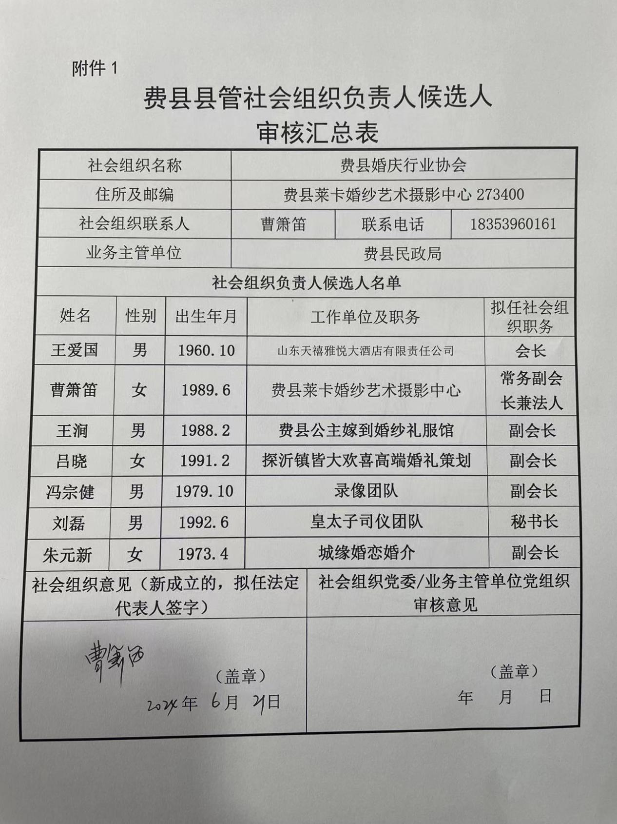| 费县婚庆行业协会第一届负责人候选人人选公示 | ||||||||||||||||||||||||