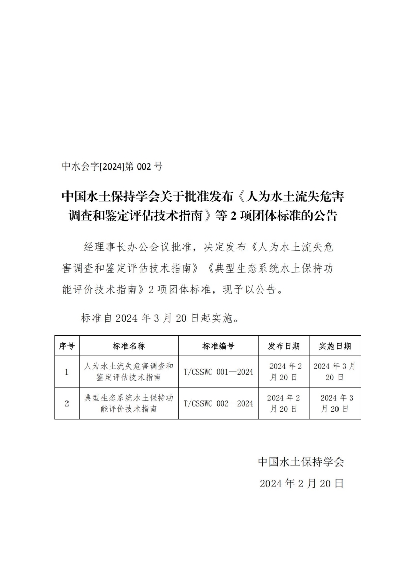 中国水土保持学会关于批准发布《人为水土流失危害调查和鉴定评估技术指南》等2项团体标准的公告