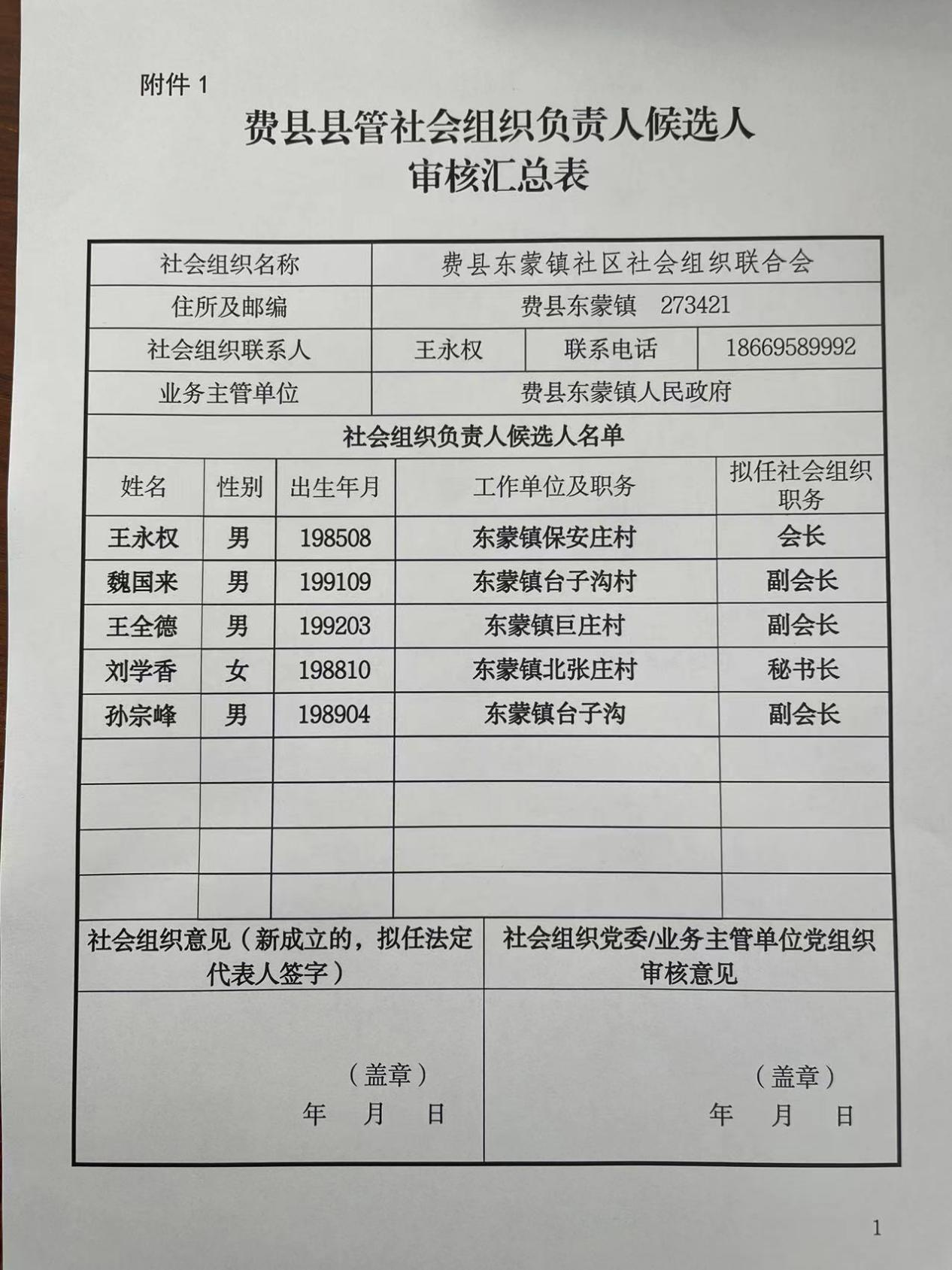 | 费县东蒙镇社区社会组织联合会第一届负责人候选人人选公示 | ||||||||||||||||||||||||