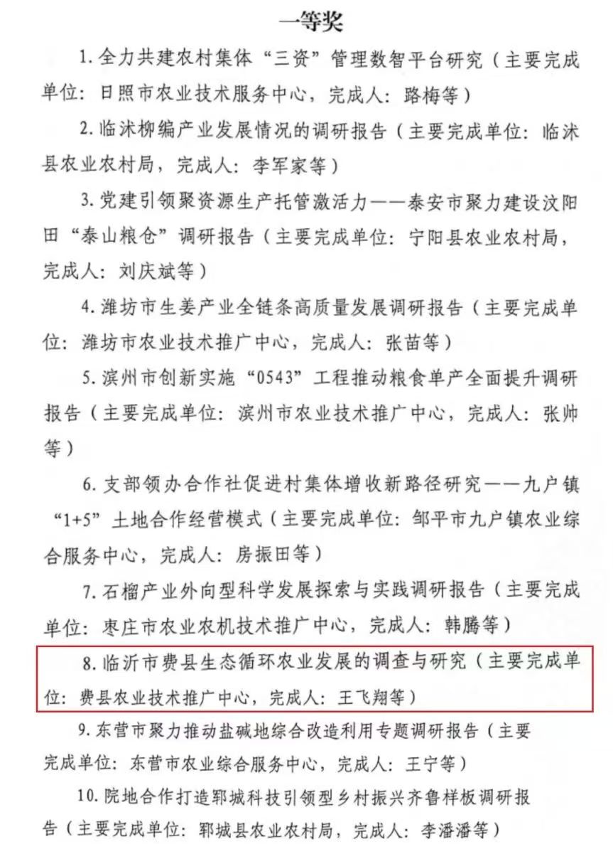 近 日 山东省农业技术推广中心 山东省农业农村发展研究中心 山东省农林水工会 公布2024年度全省农技推广服务 大竞赛结果 《临沂市费县生态循环农业发展的 调查与研究》 获评“优秀农业农村发展研究成果竞赛” 一等奖 2024年度全省农技推广服务大竞赛 “优秀农业农村发展研究成果竞赛”获奖名单